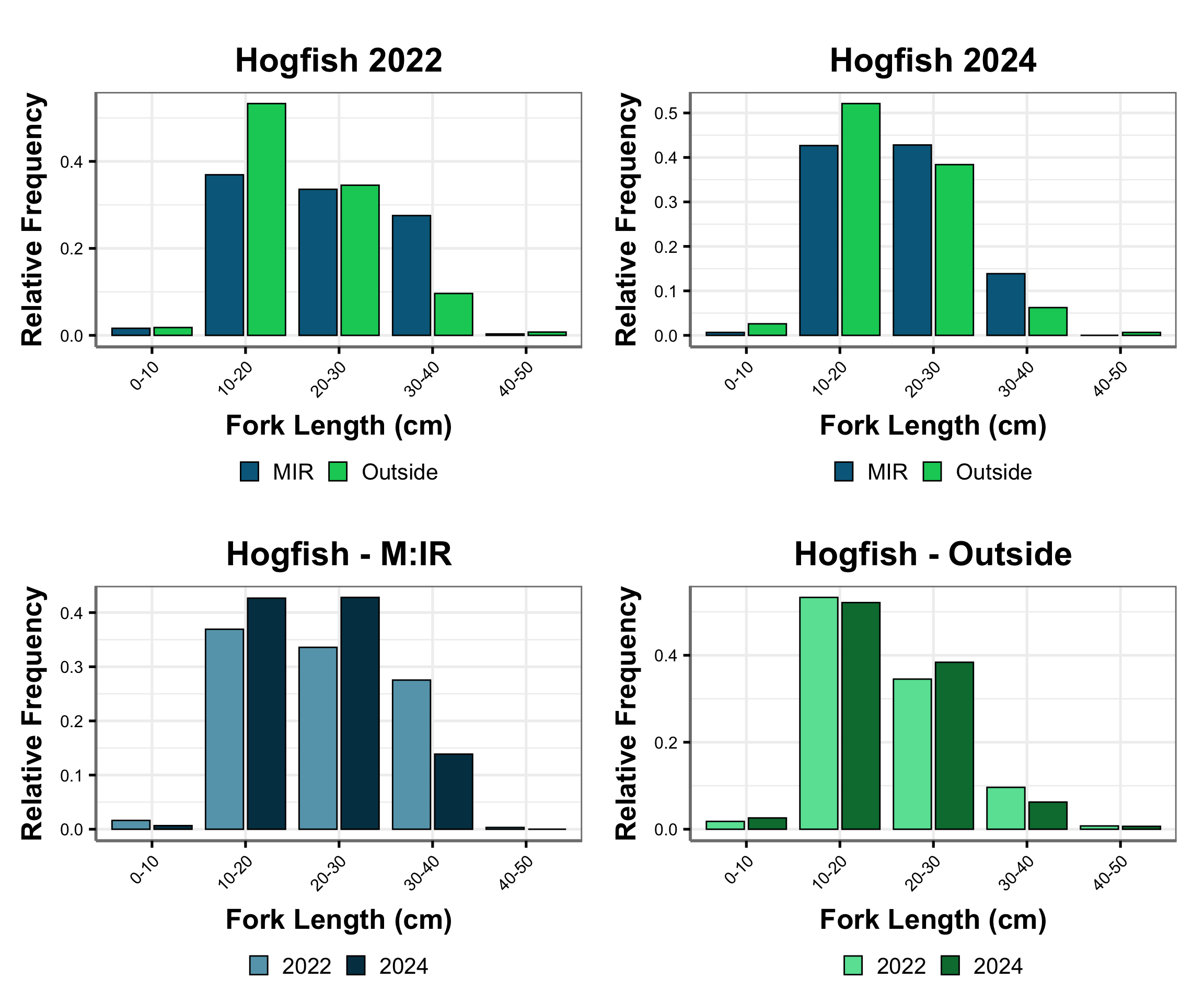 Length compositions provide a detailed description of a fish’s population structure. These highly informative figures can show the length at which a species recruits to the coral reef from their nursery habitat, the length classes that are selected by local recreational and commercial fisheries, the effectiveness of fisheries management regulations, and the success of habitat restoration efforts. Successful coral restoration improves habitat quality and reef complexity, which provides structural protection for smaller size classes and foraging opportunities for larger sizes classes.